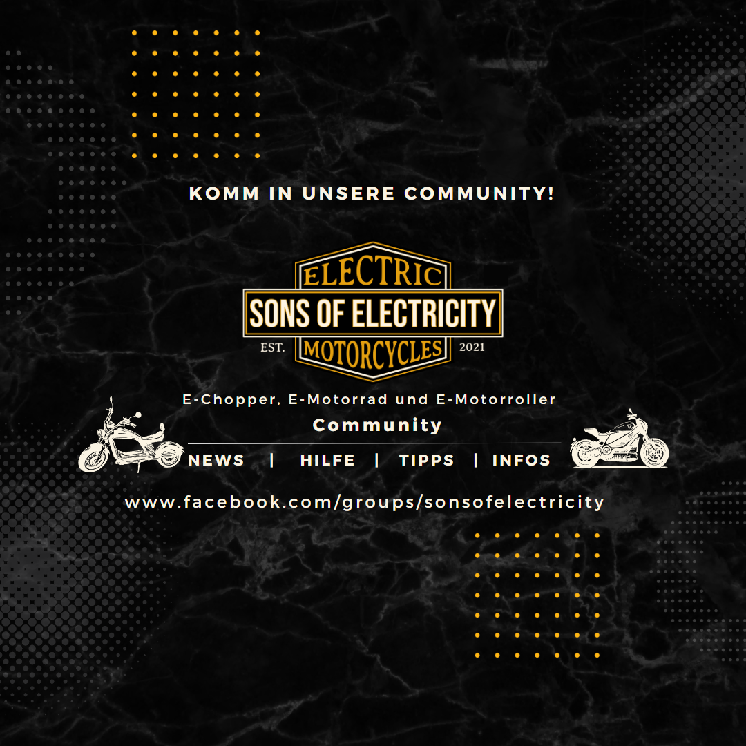 Du liebst deine E-Chopper, E-Motorrad oder E-Motorroller,  und möchtest dich mit Gleichgesinnten austauschen, oder du bist neu im Thema und möchtest interessante Informationen und News? Du suchst nach Tipps, Ratschlägen und der Möglichkeit, deine Erfahrungen mit anderen E-Mobilitätsfans zu teilen? Du willst immer als Erster über exklusive Neuigkeiten und Angebote von SONS OF ELECTRICITY informiert sein? Dann haben wir genau das Richtige für dich! Tritt unserer brandneuen Facebook-Gruppe "SONS OF ELECTRICITY - E-Chopper, E-Motorrad, E-Motorroller Community" bei.